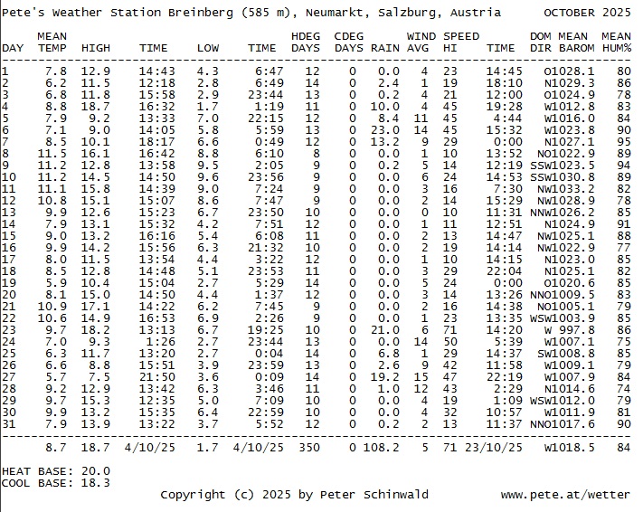 Tabelle für den Monat OKTOBER 2025