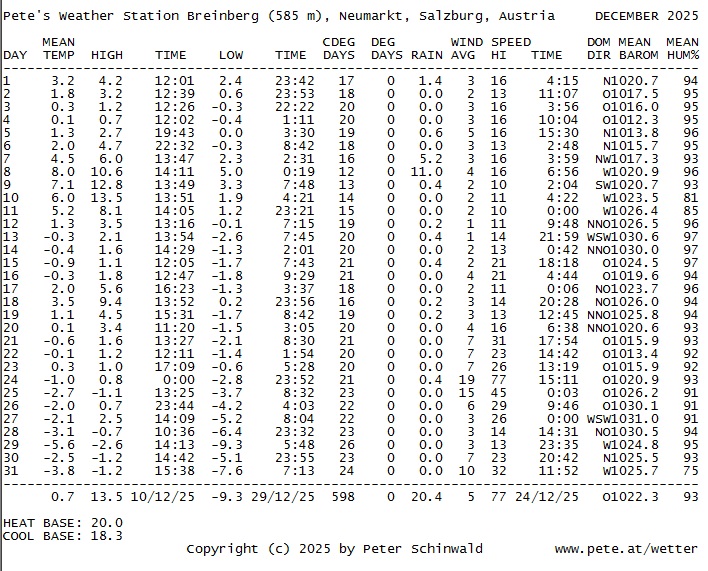 Tabelle für den Monat DEZEMBER 2025